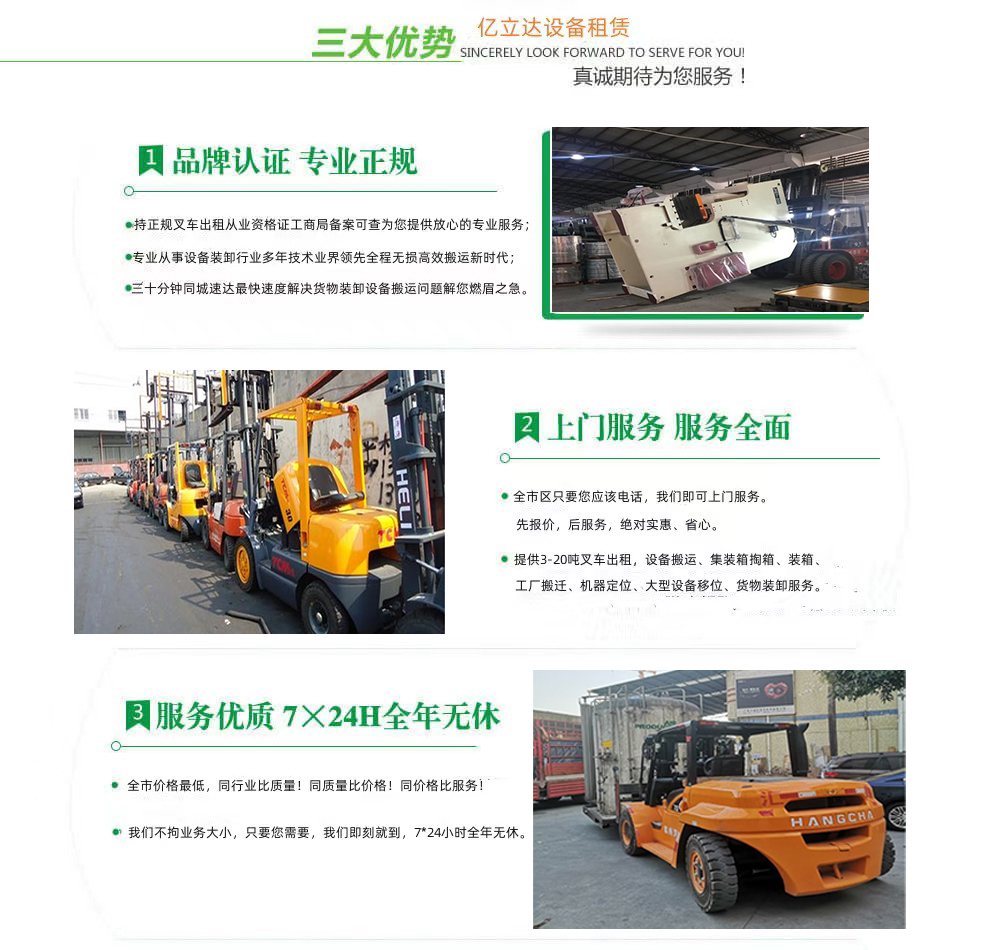 亿立达设备租赁有限公司是工商局准许的武汉光谷专业叉车出租公司,公司本着诚信、服务、效率、创新的经营理念,用精湛的技术,真诚的服务,为众多客户提供优质的服务,同时获得信赖与支持。专业提供武汉光谷3-20吨叉车出租、叉车租赁、设备搬运、集装箱掏箱装箱、机器移位定位、货物装卸、工厂搬迁、安全可靠,收费透明,价格便宜,随叫随到,24小时上门服务!本公司叉车吊车师傅对各种设备搬运装卸都有深刻探讨和研究。很多的疑难设备搬运,通过我公司的叉车师傅都能迎刃而解。对各种进口设备、国产机器、大型设备搬迁、高难度搬迁、各种精密仪器、医疗设备、科研设备等都能搬运; 提供全市 24 小时上门装卸搬运服务。同时提供厂房搬迁服务。 ...